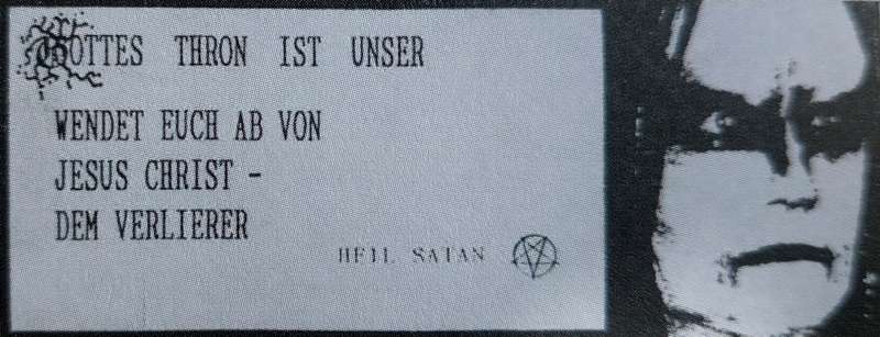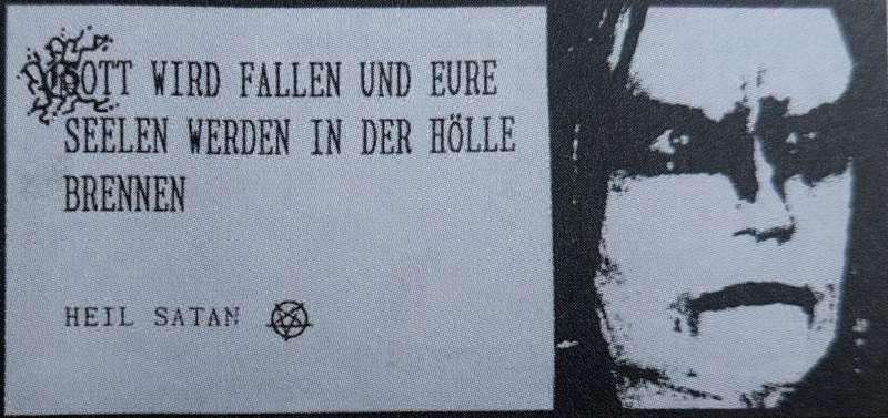 Меня учили латыни в начальной школе, с 12 или 13 лет, а затем в средней школе. Кроме того, это язык религии, западных церковных писаний, в целом то, что ассоциируется с высшим образованием, тёмными искусствами и средневековыми традициями. Все им пользовались: «Dominus Sathanas» BURZUM, «De Mуsteriis Dom Sathanas» MAYHEM, были демо-записи STIGMA DIABOLICUM, «Musaeum Hermeticum» MONUMENTUM и так далее. Мы ведь не представляем себе сатанинские обряды без хорошей доли латинского бормотания! Учитывая тему нашего второго демо, это был очевидный выбор. Песня «Animae Tortae» действительно имеет атмосферу ABRUPTUM, уровень экспериментов и импровизаций, а также способ, которым они записывали свои альбомы, а именно в темноте, нанося друг другу увечья. Да, какой блестящий ум был у Tony Särkkä, он же It! И как рано он задумал и записал свою чернейшую форму metal. Группа была образована в 1989 году, а демо было выпущено в 1990 году, они, безусловно, были в авангарде нашего движения и оказали влияние на норвежскую сцену. Чистое зло, полнейшая тьма! Слава ABRUPTUM! Я был в контакте с It до того, как он покинул этот мир.