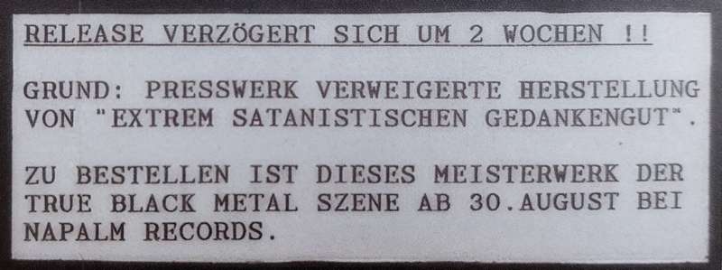Нет, она распространилась вскоре после этого, с очень запутанным названием. В марте 1994 года события происходили с головокружительной скоростью. После промо-кассеты 2/94 – нашего третьего демо – мы немедленно сочинили и записали «Moonrise» и заключили сделку с Napalm ещё до его фактического выпуска. Итак, вы найдёте ссылку на Napalm и на наш дебютный альбом уже на обложке 4-го демо, адрес лейбла, напечатанный на сопроводительном флаере, всё ещё охватывающем наш демо-период с Rune, а также на промо-сборнике, который был просто кассетой «best of», сделанной для представления лучших песен из наших демо. Эту промо-кассету также можно рассматривать как первый проблеск того, как может выглядеть трек-лист «Verwüstung», она предназначалась исключительно для фанзинов, её не следует путать с 3-м демо. Всё это произошло сразу за несколько недель после промо-кассеты 2/94 – и до выпуска «Moonrise». Безумная скорость написания текстов, записи песен и выпуска чего-либо сохранялась до «Opus IV», пока один релиз издавался, следующий был уже написан или даже записан. Это касается всей black metal сцены того времени.